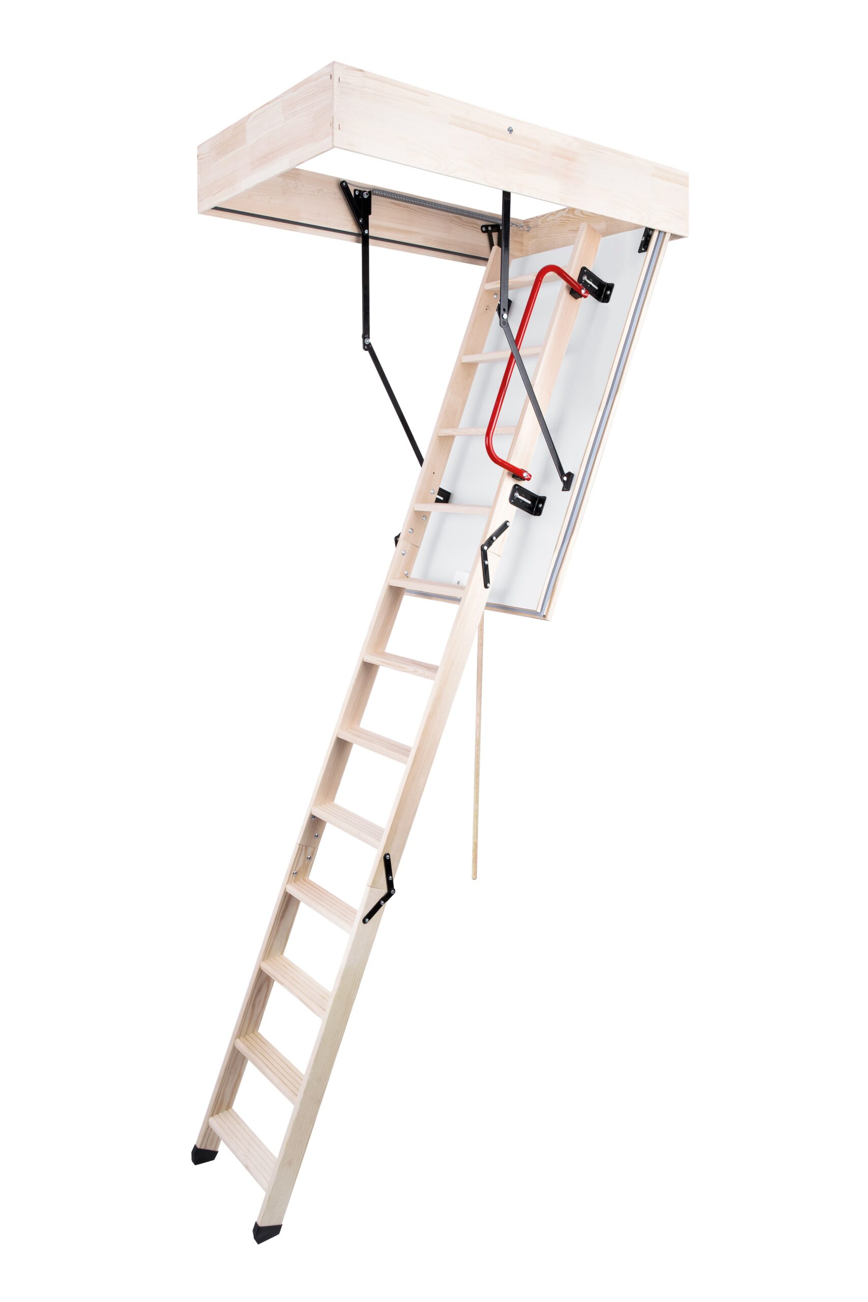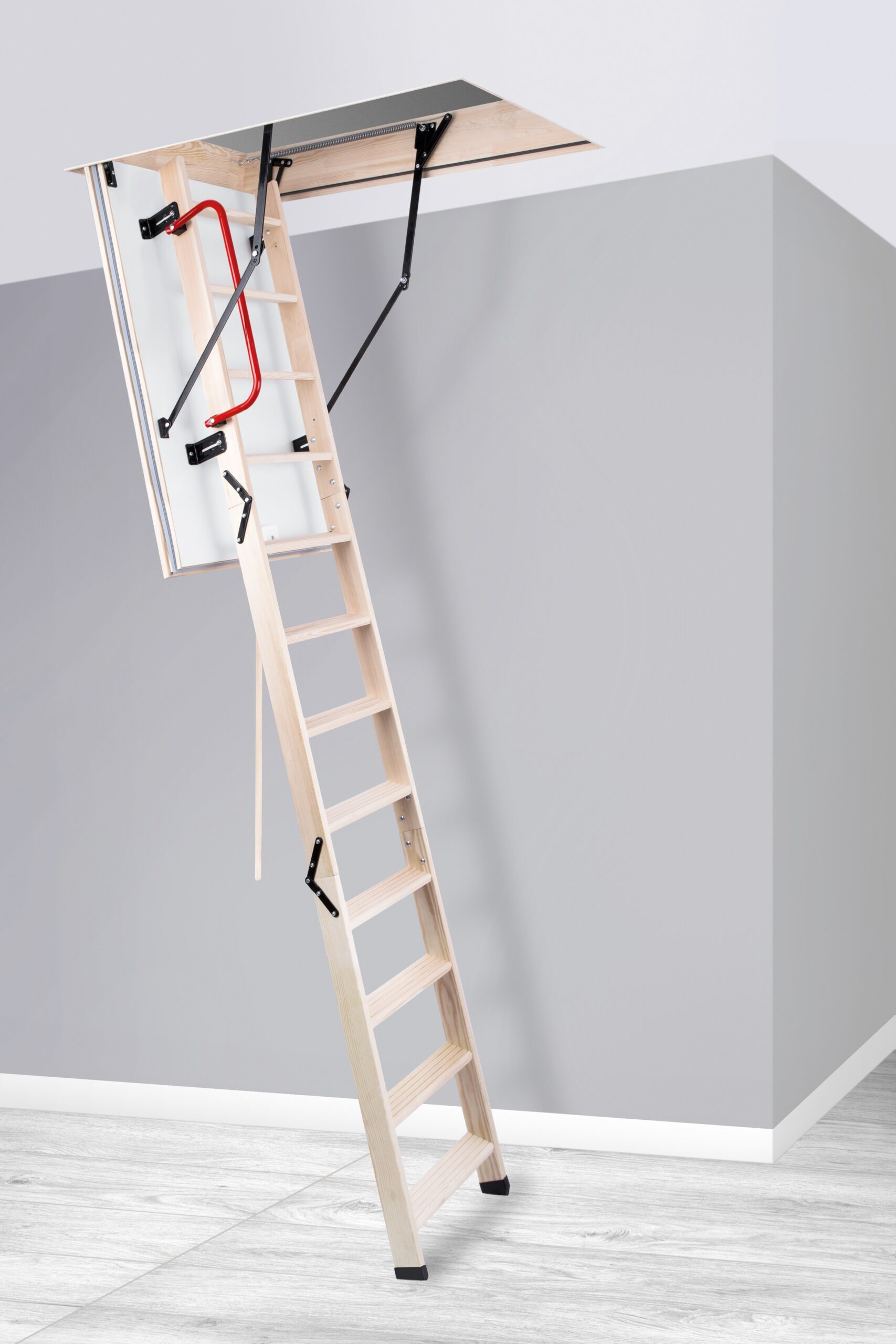Дерев’яні 3-х секційні сходи виготовлені з сосни без сучків, для приміщень висотою до 280 см, з термоізоляційною кришкою товщиною 56 мм та двоконтурною системою ущільнювачів. У стандартну комплектацію входить металевий поручень.
